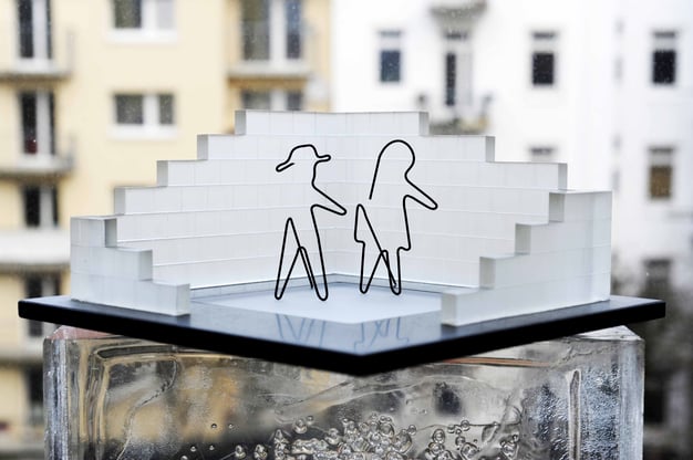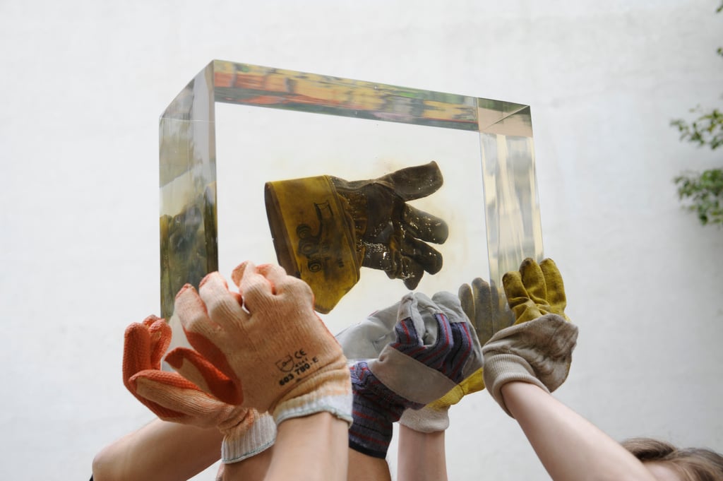 Die in glasklarem, transparentem Acryl eingebetteten Arbeits-Handschuhe sind für den Betrachter sowohl von innerhalb der begehbaren Skulptur, wie auch von aussen zu besichtigen. Dadurch wird der schwebende Charakter der Handschuhe unterstrichen. Die gesamte Skulptur wirkt transparent und lichtdurchlässig.